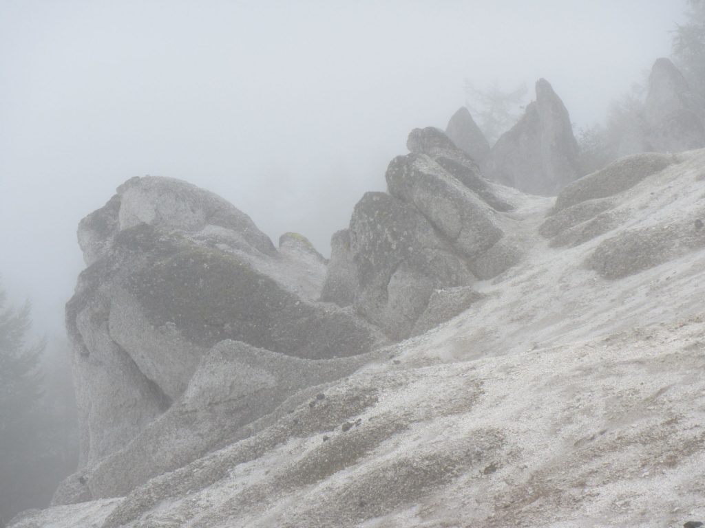 天気はいまひとつ。頂上はガスに包まれ甲斐駒の雄姿は望めませんでしたが、白砂のモニュメントは幻想的でした。